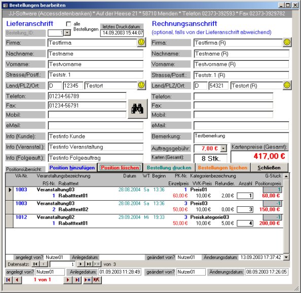 7. | Bestellvorgang mit Liefer- und Rechnungsanschrift und Auswahl mehrerer Veranstaltungen, Preiskategorien und Rabattstufen |